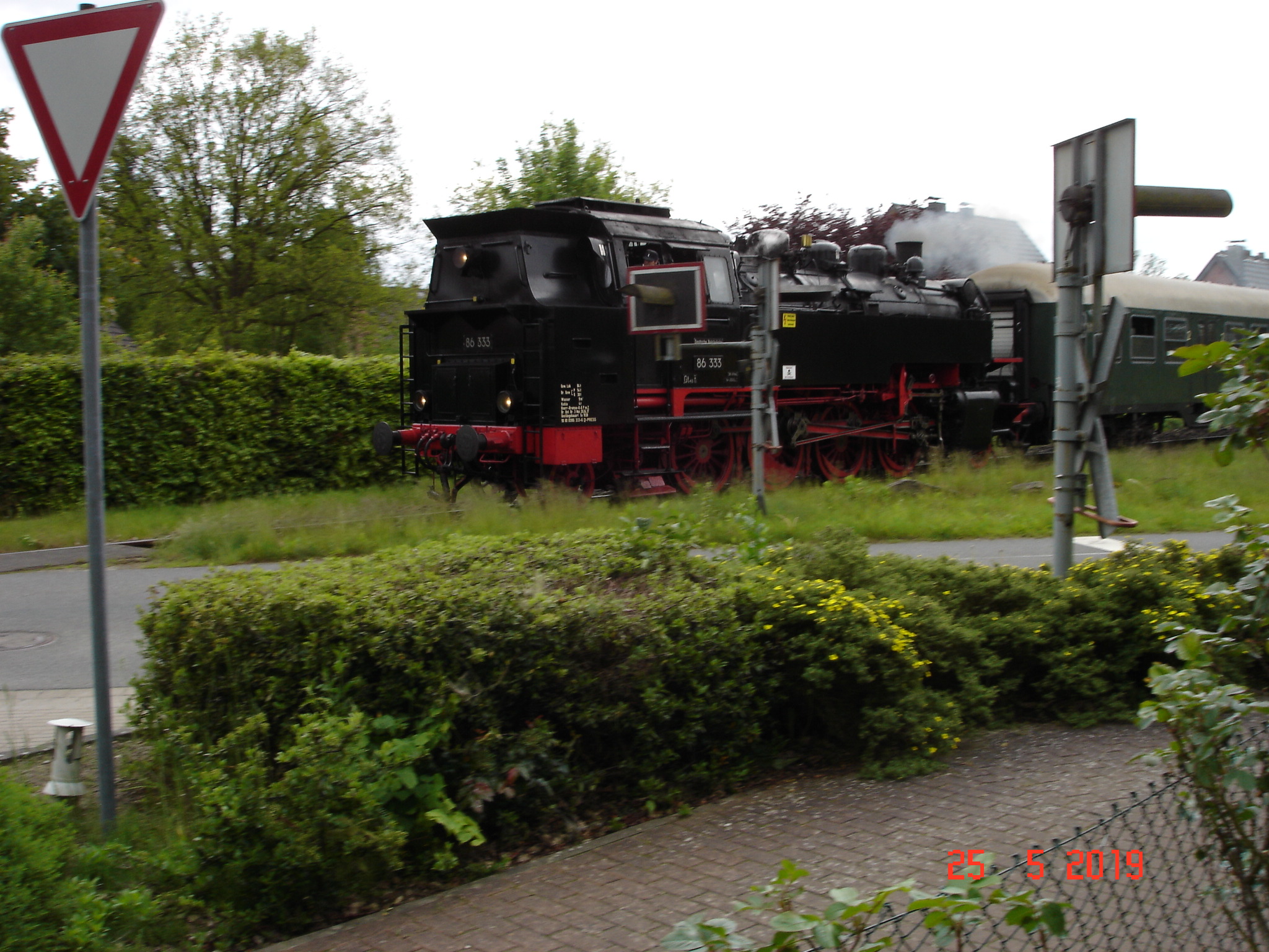 Gestern am 25.05.19 vernahmen wir einige inzwischen ungewöhnlichen Signaltöne und waren nicht wenig überrascht, als dann eine Dampflok mit einigen Personenzugwaggons unmittelbar an unserem Grundstück vorbei fuhr.